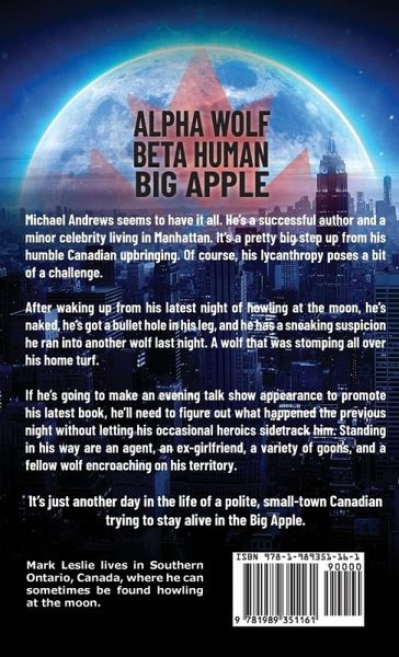 ALPHA WOLF BETA HUMAN BIG APPLE Michael Andrews seems to have it all. He's a successful author and a minor celebrity living in Manhattan. It's a pretty big step up from his humble Canadian upbringing. Of course, his lycanthropy poses a bit of a challenge. After waking up from his latest night of howling at the moon, he's naked, he's got a bullet hole in his leg, and he has a sneaking suspicion he ran into another wolf last night. A wolf that was stomping all over his home turf. If he's going to make an evening talk show appearance to promote his latest book, he'll need to figure out what happened the previous night without letting his occasional heroics sidetrack him. Standing in his way are an agent, an ex-girlfriend, a variety of goons, and a fellow wolf encroaching on his territory. It's just another day in the life of a polite, small-town Canadian trying to stay alive in the Big Apple. A Canadian Werewolf in New York is a humorous thriller about an ordinary man dealing with extraordinary circumstances. If you like seeing an everyman try to "do right" no matter the odds, then you'll love this suspenseful and comedic tale of a Canadian bumpkin who happens to be part wolf.