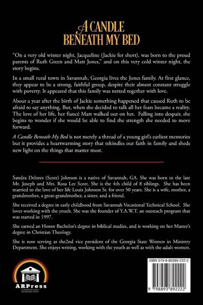 "On a very old winter night, Jacqueline (Jackie for short), was born to the proud parents of Ruth Green and Matt Jones," and on this very cold winter night, the story begins. In a small rural town in Savannah, Georgia lives the Jones family. At first glance, they appear to be a strong, faithful group, despite their almost constant struggle with poverty. It appeared that this family was netted together with love. About a year after the birth of Jackie something happened that caused Ruth to be afraid to say anything. But, when she decided to talk all her fears became a reality. The love of her life, her fiancé Matt walked out on her. Falling into despair, she begins to wonder if she would be able to find the strength she needed to move forward. A Candle Beneath My Bed is not merely a thread of a young girl's earliest memories but it provides a heartwarming story that rekindles our faith in family and sheds new light on the things that matter most.