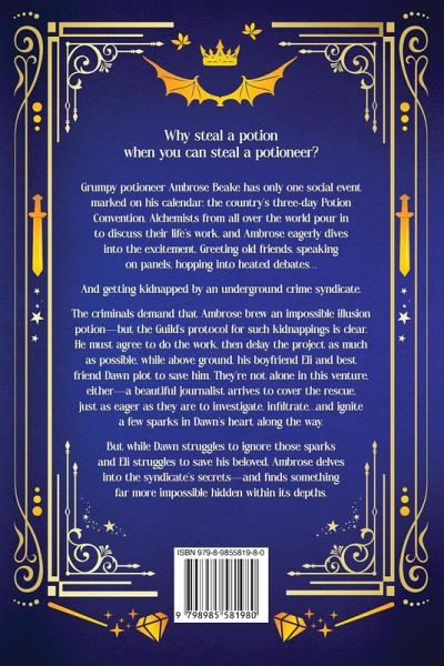 Why steal a potion when you can steal a potioneer? Grumpy potioneer Ambrose Beake has only one social event marked on his calendar: the country's three-day Potion Convention. Alchemists from all over the world pour in to discuss their life's work, and Ambrose eagerly dives into the excitement. Greeting old friends, speaking on panels, hopping into heated debates... And getting kidnapped by an underground crime syndicate. The criminals demand that Ambrose brew an impossible illusion potion-but the Guild's protocol for such kidnappings is clear. He must agree to do the work, then delay the project as much as possible, while above ground, his boyfriend Eli and best friend Dawn plot to save him. They're not alone in this venture, either-a beautiful journalist arrives to cover the rescue, just as eager as they are to investigate, infiltrate...and ignite a few sparks in Dawn's heart along the way. But while Dawn struggles to ignore those sparks and Eli struggles to save his beloved, Ambrose delves into the syndicate's secrets-and finds something far more impossible hidden within its depths.