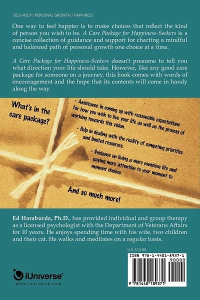 One way to feel happier is to make choices that support your vision of the kind of person you wish to be. A Care Package for Happiness-Seekers is a refreshingly thoughtful and concise collection of tips, theory, and support to help you to find happiness on a more regular basis no matter what your issues are. This user-friendly yet powerful guide will help you chart a mindful and balanced journey of personal growth. Unlike most other books on personal growth, A Care Package for Happiness-Seekers doesn't presume to tell you what direction your life should take. However, like any good care package, this book is filled with words of encouragement and support with the hope that it will provide things that you may be missing. What's in the care package? Assistance in coming up with reasonable expectations for how you wish to live your life as well as the process of working towards this vision. Help in dealing with the reality of competing priorities and limited resources. Guidance on living a more conscious life and paying more attention to your moment to moment choices. And so much more!