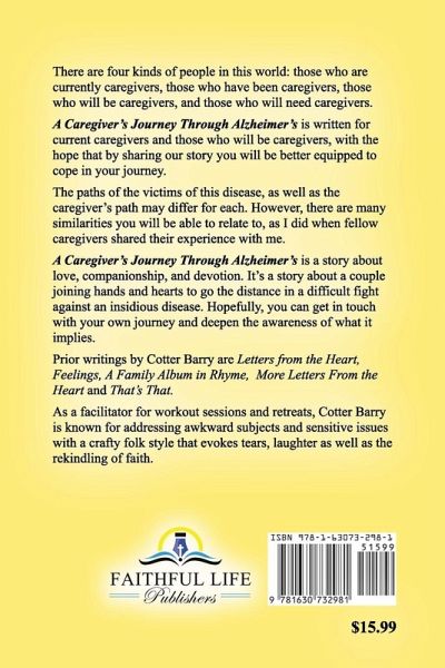 There are four kinds of people in this world: those who are currently caregivers, those who have been caregivers, those who will be caregivers, and those who will need caregivers. "A caregiver's journey through Alzheimer's" is written for current caregivers and those who will be caregivers, with the hope that by sharing our story you will be better equipped to cope in your journey. The paths of the victims of this disease, as well as the caregiver's path may differ for each. However, there are many similarities you will be able to relate to, as I did when fellow caregivers shared their experience with me. "A caregiver's journey through Alzheimer's" is a story about love, companionship, and devotion. It's a story about a couple joining hands and hearts to go the distance in a difficult fight against an insidious disease. Hopefully, you can get in touch with your own journey and deepen the awareness of what it implies. Prior writings by Cotter Barry are "Letters from the Heart", "Feelings", "A Family Album in Rhyme", "More Letters From the Heart", and "That's That". As a facilitator for workout sessions and retreats, Cotter Barry is known for addressing awkward subjects and sensitive issues with a crafty folk style that evokes tears, laughter as well as the rekindling of faith.