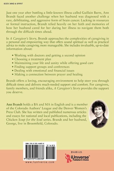 "One caregiver's chronicles of the journey she took with her husband, as they battled his brain tumor. Beautifully written."-Naomi Berkowitz, Executive Director, American Brain Tumor Association Just one year after battling a little-known illness called Guillain Barre, Ann Brandt faced another challenge when her husband was diagnosed with a rare, debilitating, and aggressive form of brain cancer. Lacking in resources or formal instruction, Brandt relied heavily on her faith and memories of how her husband cared for her during her illness to navigate them both through the difficult times ahead. In A Caregiver's Story, Brandt approaches the complexities of caregiving in a personal and empowering way that offers sound spiritual as well as practical advice to make caregiving more manageable. She includes invaluable, up-to-date information about: Working with doctors and getting a second opinion Choosing a treatment plan Maintaining your life and sanity while offering good care Finding support groups and conferences Dealing with emotional and financial issues Making a connection between prayer and healing Brandt offers a loving, encouraging environment to help steer you through difficult times and delivers much-needed support and comfort. For caregivers, family members, and friends alike, A Caregiver's Story provides the support you deserve.