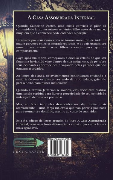 Quando Catherine Porter, uma cristã convicta e pilar da comunidade local, assassinou seu único filho antes de se matar, ninguém que a conheceu pode entender o porquê. Difamada por seus crimes, ela se tornou sinônimo de tudo de mau e perverso entre os moradores locais, e os pais usaram seu nome para assustar seus filhos errantes para que se comportassem. Logo após sua morte, começaram a circular relatos de que seu fantasma havia sido visto dentro de sua antiga casa, de pé sobre seus ocupantes adormecidos e vagando pelas paredes quando estavam acordados. Ao longo dos anos, os avistamentos continuaram enviando a maioria de seus ocupantes correndo da propriedade, gritando para a noite, para nunca mais voltar. Quando a família Jefferson se mudou, eles decidiram realizar uma sessão espírita para livrar a propriedade de seu convidado indesejado de uma vez por todas. Mas, ao fazer isso, eles desencadearam algo muito mais aterrorizante - uma força malévola que não pararia por nada para retomar seu domínio, mesmo ao custo de suas vidas. Esta é a edição de letras grandes do livro A Casa Assombrada Infernal, com uma fonte diferenciada e maior para uma leitura mais agradável.