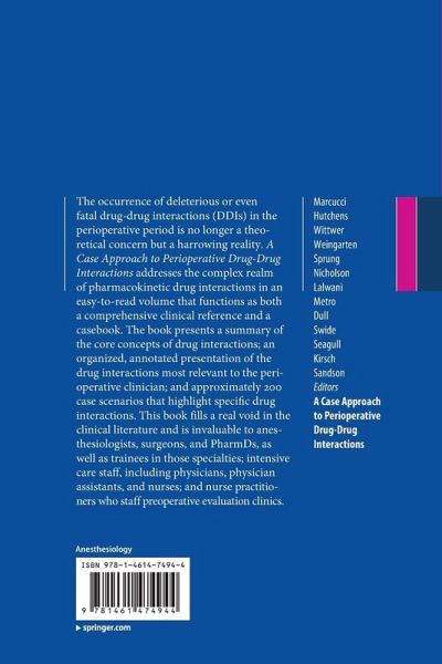 The occurrence of deleterious or even fatal drug-drug interactions (DDIs) in the perioperative period is no longer a theoretical concern but a harrowing reality. A Case Approach to Perioperative Drug-Drug Interactions addresses the complex realm of pharmacokinetic drug interactions in an easy-to-read volume that functions as both a comprehensive clinical reference and a casebook. The book presents a summary of the core concepts of drug interactions; an organized, annotated presentation of the drug interactions most relevant to the perioperative clinician; and approximately 200 case scenarios that highlight specific drug interactions. This book fills a real void in the clinical literature and is invaluable to anesthesiologists and surgeons, as well as trainees in both specialties; intensive care staff, including physicians, physician's assistants, and nurses; and nurse practitioners who staff preoperative evaluation clinics.