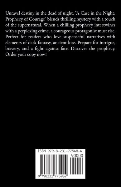 Unravel destiny in the dead of night. "A Case in the Night: Prophecy of Courage" blends thrilling mystery with a touch of the supernatural. When a chilling prophecy intertwines with a perplexing crime, a courageous protagonist must rise. Perfect for readers who love suspenseful narratives with elements of dark fantasy, ancient lore. Prepare for intrigue, bravery, and a fight against fate. Discover the prophecy. Order your copy now!
