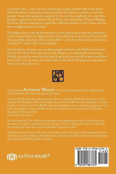 Clues that solve a crime can be as evanescent as virga: rain that falls in the desert which the desert's rising heat evaporates before the rain has a chance to reach the ground. Using Zen's pragmatic approach to discover the complexity of a crime that had been regarded as 'cut and dry,' Beryl Tilson and Sensei Percy Wong of Wagner & Tilson, Private Investigators, apply their skill and intuition to free a man who has been wrongly accused of murder. The biggest clue to solving this mystery is in the false evidence that was submitted at trial. A gun which was alleged to have lain in the Sonora desert for 5 hours in July was apparently picked up without "pot holders" - directly in the hand and shown to a covering TV camera. This cannot happen. But the defense attorneys are not desert people and know only Hollywood versions of desert life. Beryl Tilson has lived in the Mojave and understands sun and heat. Nobody can pick up metal that has been lying in the sun for half an hour much less 5 hours. (Also you can never see sweaty shirts in the desert. Perspiration evaporates as fast as you can produce it.)