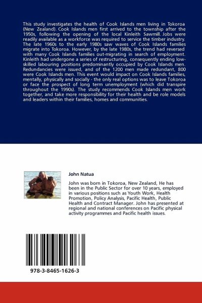 This study investigates the health of Cook Islands men living in Tokoroa (New Zealand). Cook Islands men first arrived to the township after the 1950s, following the opening of the local Kinleith Sawmill. Jobs were readily available as a workforce was required to service the timber industry. The late 1960s to the early 1980s saw waves of Cook Islands families migrate into Tokoroa. However, by the late 1980s, the trend had reversed with many Cook Islands families out-migrating in search of employment. Kinleith had undergone a series of restructuring, consequently ending low-skilled labouring positions predominantly occupied by Cook Islands men. Redundancies were issued, and of the 1200 men made redundant, 800 were Cook Islands men. This event would impact on Cook Islands families, mentally, physically and socially - the only real options was to leave Tokoroa or face the prospect of long term unemployment (which did transpire throughout the 1990s). The study recommends Cook Islandsmen work together, and take more responsibility for their health and be role models and leaders within their families, homes and communities.