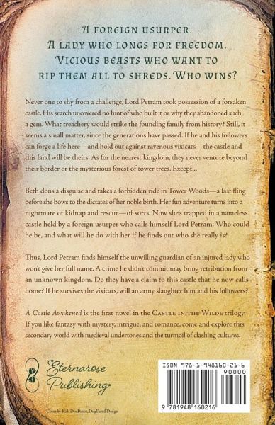 A foreign usurper. A lady who longs for freedom. Secrets more dangerous than beasts. Never one to shy from a challenge, Lord Tristan Petram took possession of a forsaken castle. His search uncovered no hint of who built it or why they abandoned such a gem. What treachery would strike the founding family from history? Still, it seems a small matter, since the generations have passed. If he and his followers can forge a life here-and hold out against ravenous vixicats-the castle and this land will be theirs. As for the nearest kingdom, they never venture beyond their border or the mysterious forest of tower trees. Except... Beth dons a disguise and takes a forbidden ride in Tower Woods-a last fling before she bows to the dictates of her noble birth. Her fun adventure turns into a nightmare of kidnap and rescue-of sorts. Now she's trapped in a nameless castle held by a foreign usurper who calls himself Lord Petram. Who could he be, and what will he do with her if he finds out who she really is? Thus, Lord Petram finds himself the unwilling guardian of an injured lady who won't give her full name. A crime he didn't commit may bring retribution from an unknown kingdom. Do they have a claim to this castle that he now calls home? If he survives the vixicats, will an army slaughter him and his followers? A Castle Awakened is the first novel in the Castle in the Wilde trilogy. If you like fantasy with mystery, intrigue, and romance, come and explore this secondary world with medieval undertones and the turmoil of clashing cultures.