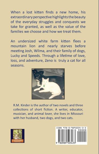 An undersized white farm kitten flees a mountain lion and nearly starves before meeting Josh, Wilma, and their family of dogs, Lucky and Speeds. Zeno's extraordinary perspective and personality highlights the beauty of the everyday struggles and conquests we take for granted, as well as the value of the families we choose and how we treat them. He meets bully cat Arthur, loses a true friend, experiences the joy and struggles of changing family relationships and the call of the wild. Through a lifetime of love, loss, and adventure, Zeno is truly a cat for all seasons.