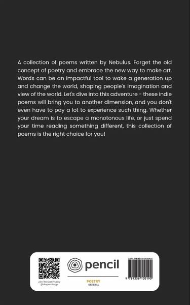 A collection of poems written by Nebulus. Forget the old concept of poetry and embrace the new way to make art. Words can be an impactful tool to wake a generation up and change the world, shaping people's imagination and view of the world. Let's dive into this adventure - these indie poems will bring you to another dimension, and you don't even have to pay a lot to experience such thing. Whether your dream is to escape a monotonous life, or just spend your time reading something different, this collection of poems is the right choice for you!