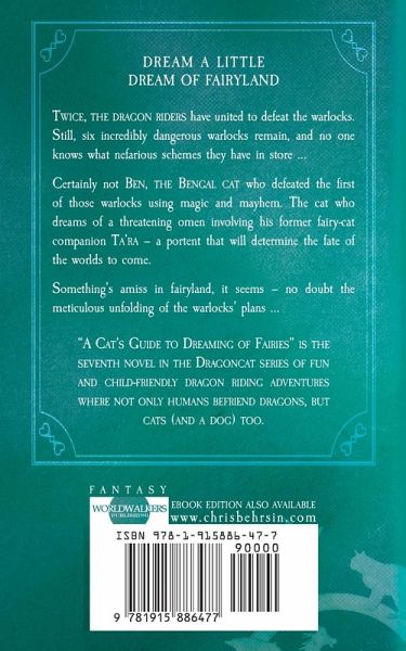 Dream a little dream of fairyland ... Twice, the dragon riders have united to defeat the warlocks. Still, six incredibly dangerous warlocks remain, and no one knows what nefarious schemes they have in store ... Certainly not Ben, the Bengal cat who defeated the first of those warlocks using magic and mayhem. The cat who dreams of a threatening omen involving his former fairy-cat companion Ta'ra - a portent that will determine the fate of the worlds to come. Something's amiss in fairyland, it seems - no doubt the meticulous unfolding of the warlocks' plans ... "A Cat's Guide to Dreaming of Fairies" is the seventh novel in the Dragoncat series of fun and child-friendly dragon riding adventures where not only humans befriend dragons, but cats (and a dog) too. Something's amiss in fairyland, it seems. And it no doubt has something to do with the meticulous unfolding of the warlocks' plans. "A Cat's Guide to Dreaming of Fairies" is the seventh novel in the Dragoncat series of fun and child-friendly dragon riding adventures where not only humans befriend dragons, but cats (and a dog) too.