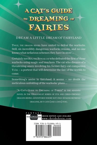 Dream a little dream of fairyland ... Twice, the dragon riders have united to defeat the warlocks. Still, six incredibly dangerous warlocks remain, and no one knows what nefarious schemes they have in store ... Certainly not Ben, the Bengal cat who defeated the first of those warlocks using magic and mayhem. The cat who dreams of a threatening omen involving his former fairy-cat companion Ta'ra - a portent that will determine the fate of the worlds to come. Something's amiss in fairyland, it seems - no doubt the meticulous unfolding of the warlocks' plans ... "A Cat's Guide to Dreaming of Fairies" is the seventh novel in the Dragoncat series of fun and child-friendly dragon riding adventures where not only humans befriend dragons, but cats (and a dog) too. Something's amiss in fairyland, it seems. And it no doubt has something to do with the meticulous unfolding of the warlocks' plans. "A Cat's Guide to Dreaming of Fairies" is the seventh novel in the Dragoncat series of fun and child-friendly dragon riding adventures where not only humans befriend dragons, but cats (and a dog) too.