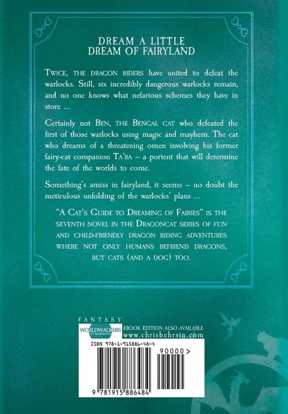 Dream a little dream of fairyland ... Twice, the dragon riders have united to defeat the warlocks. Still, six incredibly dangerous warlocks remain, and no one knows what nefarious schemes they have in store ... Certainly not Ben, the Bengal cat who defeated the first of those warlocks using magic and mayhem. The cat who dreams of a threatening omen involving his former fairy-cat companion Ta'ra - a portent that will determine the fate of the worlds to come. Something's amiss in fairyland, it seems - no doubt the meticulous unfolding of the warlocks' plans ... "A Cat's Guide to Dreaming of Fairies" is the seventh novel in the Dragoncat series of fun and child-friendly dragon riding adventures where not only humans befriend dragons, but cats (and a dog) too. Something's amiss in fairyland, it seems. And it no doubt has something to do with the meticulous unfolding of the warlocks' plans. "A Cat's Guide to Dreaming of Fairies" is the seventh novel in the Dragoncat series of fun and child-friendly dragon riding adventures where not only humans befriend dragons, but cats (and a dog) too.