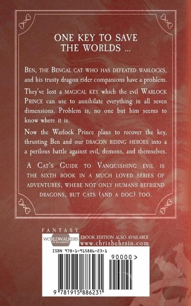 One key to save the worlds ... Ben, the Bengal cat who has defeated warlocks, and his trusty dragon rider companions have a problem. They've lost a magical key which the evil Warlock Prince can use to annihilate everything in all seven dimensions. Problem is, no one but him seems to know where it is. Now the Warlock Prince plans to recover the key, thrusting Ben and our dragon riding heroes into a a perilous battle against evil, demons, and themselves. A Cat's Guide to Vanquishing evil is the sixth book in a much loved series of adventures, where not only humans befriend dragons, but cats (and a dog) too.