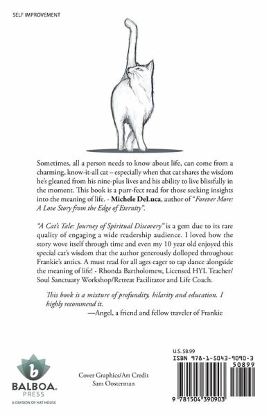 Sometimes, all a person needs to know about life, can come from a charming, know-it-all cat - especially when that cat shares the wisdom he's gleaned from his nine-plus lives and his ability to live blissfully in the moment. This book is a purr-fect read for those seeking insights into the meaning of life. - Michele DeLuca, author of "Forever More: A Love Story from the Edge of Eternity". "A Cat's Tale: Journey of Spiritual Discovery" is a gem due to its rare quality of engaging a wide readership audience. I loved how the story wove itself through time and even my 10 year old enjoyed this special cat's wisdom that the author generously dolloped throughout Frankie's antics. A must read for all ages eager to tap dance alongside the meaning of life! - Rhonda Bartholomew, Licensed HYL Teacher/Soul Sanctuary Workshop/Retreat Facilitator and Life Coach. This book is a mixture of profundity, hilarity and education. I highly recommend it. -Angel, a friend and fellow traveler of Frankie