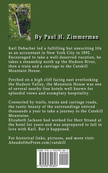Catskill historical novel Karl Debacher led a fulfilling but unexciting life as an accountant in New York City in 1892. Encouraged to take a well-deserved vacation, he takes a steamship north up the Hudson River, then a train and a carriage to the Catskill Mountain House. Perched on a high cliff facing east overlooking the Hudson Valley, the Mountain House was one of several nearby fine hotels well known for splendid views and exemplary hospitality. Connected by trails, trains and carriage roads, the rustic beauty of the surroundings enticed thousands a year to take a journey to the Catskill Mountains. Elizabeth Jackson had worked for Herr Strand at the hotel for years and was unprepared to fall in love with Karl. But it happened. From the author Camping and hiking for many years in the beautiful Catskill Mountains of upstate New York I grew more interested in learning the history of the area. The old engravings chiseled in the stone cliff and the state information sign at the Catskill Mountain House location in Haines Falls encouraged me to learn more. Roland Van Zandt's excellent book 'The Catskill Mountain House' has many interesting (actually, fascinating) facts and stories that have been almost forgotten about the hotels and thousands of people who enjoyed the area for decades over one hundred years ago. Each hotel had different amenities and attractions. The Catskill Mountain House, the Hotel Kaaterskill, and the Laurel House Hotel were all different in their accommodations and degree of sophistication. I wrote my historical novel 'A Catskill Journey' as a love story to knit together the history of the Catskill Mountains in the late 1800's in a way that encourages readers to learn more. The hotel buildings are gone, and the foundations reclaimed by the forest. But the trails, views and waterfalls remain for us to enjoy now as visitors did then. For more information visit: AheadofThePress.com/catskill