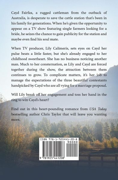 Cayd Fairfax, a rugged cattleman from the outback of Australia, is desperate to save the cattle station that's been in his family for generations. When he's given the opportunity to appear on a TV show featuring single farmers looking for a bride, he seizes the chance to gain publicity for the station and maybe even find his soul mate.When TV producer, Lily Calimeris, sets eyes on Cayd her pulse beats a little faster, but she's already engaged to her childhood sweetheart. She has no business noticing another man. Much to her consternation, as Lily and Cayd are forced together during the show, the attraction between them continues to grow. To complicate matters, it's her job to manage the expectations of the three beautiful contestants handpicked by Cayd who are all vying for a marriage proposal.Will Lily break off her engagement and toss her hand in the ring to win Cayd's heart?Find out in this heart-pounding romance from USA Today bestselling author Chris Taylor that will leave you wanting more.