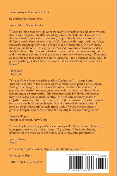 A CAUTIONARY TAIL AND OTHER PLAYS by christopher oscar peña collects for the first time full-length and short works by this acclaimed playwright. with a foreword by Naomi Iizuka and essays by Stephanie Ybarra and Stephen Stout. A roaringly wild collection of plays by a dynamic voice in US theatre.