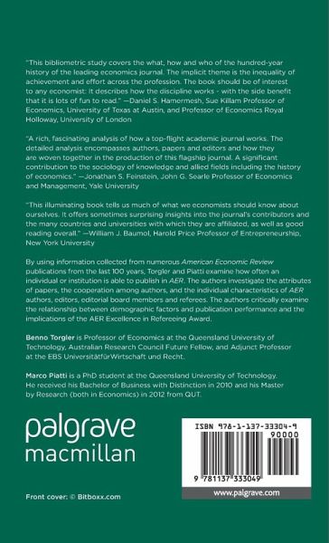 Introduction PART I: TOP INSTITUTIONS, TOP PAPERS, AND LEADING ECONOMISTS PUBLISHING IN AER 1. Institutional Rankings 2. Country Rankings 3. Top Papers 4. Publishing Frequency 5. Top Authors PART II: COOPERATION, COAUTHORSHIP, AND ALPHABETICAL NAME ORDERING PART III: DEMOGRAPHIC CHARACTERISTICS OF AER AUTHORS 6. Academic Age 7. Females Publishing in AER PART IV: AER EDITORS, COEDITORS, BOARD MEMBERS AND REFEREES 8. Editors 9. Coeditors 10. Connections between Editors and Coeditors and Citation Success 11. Board of AER Editors PART V: SUBMISSION STRATEGIES, REFEREES, AND AWARDS 12. Submission Strategies and Submitted Papers 13. Referees 14. Awards PART VI: PAPER CHARACTERISTICS 15. Length 16. Subject Areas 17. Level of Technique Conclusion Bibliography Appendix