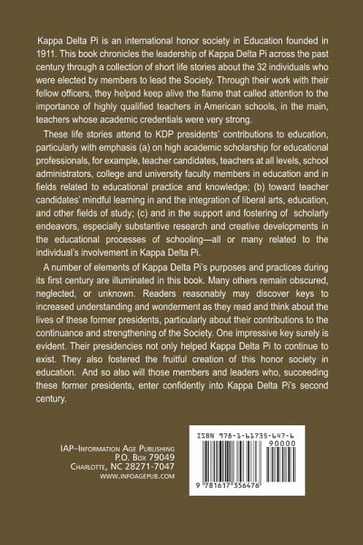 A volume in Research in Curriculum and Instruction Series Editor: O. L. Davis, Jr. The University of Texas at Austin Kappa Delta Pi is an international honor society in Education founded in 1911. This book chronicles the leadership of Kappa Delta Pi across the past century through a collection of short life stories about the 32 individuals who were elected by members to lead the Society. Through their work with their fellow officers, they helped keep alive the flame that called attention to the importance of highly qualified teachers in American schools, in the main, teachers whose academic credentials were very strong. These life stories attend to KDP presidents' contributions to education, particularly with emphasis a) on high academic scholarship for educational professionals, e.g., teacher candidates, teachers at all levels, school administrators, college and university faculty members in education and in fields related to educational practice and knowledge; b) toward teacher candidates' mindful learning in and the integration of liberal arts, education, and other fields of study; c) and in the support and fostering of scholarly endeavors, especially substantive research and creative developments in the educational processes of schooling - all or many related to the individual's involvement in Kappa Delta Pi. A number of elements of Kappa Delta Pi's purposes and practices during its first century are illuminated in this book. Many others remain obscured, neglected, or unknown. Readers reasonably may discover keys to increased understanding and wonderment as they read and think about the lives of these former presidents, particularly about their contributions to the continuance and strengthening of the Society. One impressive key surely is evident. Their presidencies not only helped Kappa Delta Pi to continue to exist. They also fostered the fruitful creation of this honor society in education. And so also will those members and leaders who, succeeding these former presidents, enter confidently into Kappa Delta Pi's second century.