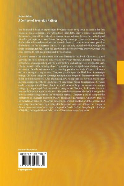 Chapter 1 presents the main issues that are addressed in this book. Chapters 2, 3, and 4 provide the key notions to understand sovereign ratings. Chapter 2 presents an overview of sovereign rating activity since the first such ratings were assigned in 1918. Chapter 3 analyzes the meaning of sovereign ratings and the significance of ratingscales; it also describes the refinement of credit rating policies and tools. Chapter 4 focuses on the sovereign rating process. Chapters 5 and 6 open the black box of sovereign ratings. Chapter 5 compares sovereign rating methodologies in the interwar years with those in the modern era. After examining how rating agencies have amended their methodologies since the 1990s, Chapter 6 scrutinizes rating disagreements between credit rating agencies (CRAs). Chapters 7 and 8 measure the performances of sovereign ratings by computing default rates and accuracy ratios: Chapter 7 looks at the interwar years and Chapter 8 at the modern era. The two chapters assess which CRA assigns the most accurate ratings during the respective periods. Chapters 9 and 10 compare the perception of sovereign risk by the CRAs and market participants. Chapter 9 focuses on the relation between JP Morgan Emerging Markets Bond Index Global spreads and emerging countries' sovereign ratings for the period 1993-2007.Chapter 10 compares the eurozone members' sovereign ratings with Credit Default Swap-Implied Ratings (CDS-IRs) during the Greek debt crisis of November 2009-May 2010.