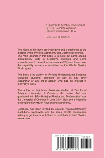 The ideas in this book are innovative and a challenge to the existing whole Physics, Astronomy and Cosmology worlds. The main attempt of this book is to point out some special contradictory facts in Einstein's concepts and some contradictions to current fundamentals of Physics, those have the capability to carry a revolution to the Whole Physics World again. This book is so worthy for Physics Undergraduates, Graduates and scientists, as well as any other researcher and any other person who has an interest in innovative ideas. Geerasee studied at Faculty of Science, University of Colombo Sri Lanka. And she graduated with BSc (Hons) in Physics and Mathematics from the University of Colombo, Sri Lanka in June 2014. Now she is intending to complete her PHD in Physics and Astronomy. Geerasee has been invited by several Astronomy/Physics institutions world-wide and by some private researchers asking to get involve with them to contribute to their researches.