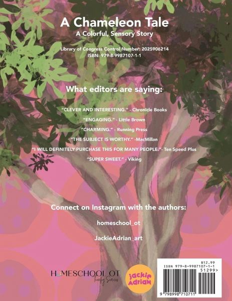 "CLEVER AND INTERESTING." - Chronicle Books "ENGAGING." - Little Brown "CHARMING." - Running Press "THE SUBJECT IS WORTHY." -MacMillan "I WILL DEFINITELY PURCHASE THIS FOR MANY PEOPLE."- Ten Speed Plus "SUPER SWEET." - Viking At any moment in time, we are taking in information about our world through our eyes, ears, nose, mouth, skin, and joints. This, sensory processing, is how we experience our world and is unique to each person. Our job as parents, caregivers, and adults in influential roles is not only to take notice of our own sensory systems, but to help children do the same. The goal of this manuscript is to bring awareness to this topic and supply tools for discussion. We, the authors, in a real-life OT session, realized the need for this book when Sarah didn't have a children's book to recommend for Jackie's child. Jackie had already completed two children's books and said, "Well, let's create what we need!" A Chameleon Tale uses the changing color of the chameleons' skin, differing facial expressions, and a variety of actions to illustrate how a sensory threshold can influence individual alertness. Likewise, as humans, our bodies, expressions, and actions also reflect specific levels of alertness. This text, accompanied by the demonstrative changing colors of skin, prompts children to recognize that this fluctuation is normal. Further, it helps communicate that there are tools to help when feelings (derived by our sensory inputs) impact their success in what they need and want to do. The book's characters, our chameleon family, will journey outside of their familiar environment, something we ask our kids to do most days of the year. Notice how this seemingly simple task affects each chameleon differently. The more experts (like co-author Sarah Collins, MSOT, OTR/L) learn about neurodiversity and the brain / body response to environmental stimuli, the greater they are realizing people process and integrate sensory stimuli differently. Through this story, the readers will gain a better understanding of their own brain / body connection and honor their unique responses while simultaneously empathizing with other's responses in the same environmental situations. Though every child and caregiver combo will benefit from communicating about their sensory needs, this book will be especially helpful for the neurodivergent community and their families. Use this book as a starting point for conversation with the children in your life. Font: Avenir (visual scanning and dyslexia-friendly) Age Group Suggestion: 6-11 years