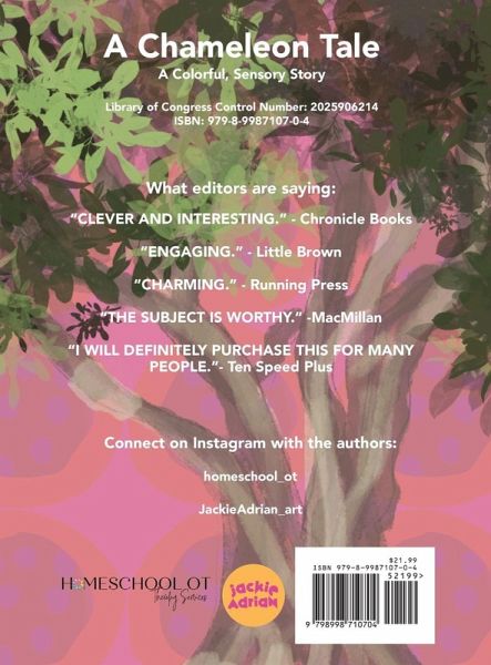 "CLEVER AND INTERESTING." - Chronicle Books "ENGAGING." - Little Brown "CHARMING." - Running Press "THE SUBJECT IS WORTHY." -MacMillan "I WILL DEFINITELY PURCHASE THIS FOR MANY PEOPLE."- Ten Speed Plus "SUPER SWEET." - Viking At any moment in time, we are taking in information about our world through our eyes, ears, nose, mouth, skin, and joints. This, sensory processing, is how we experience our world and is unique to each person. Our job as parents, caregivers, and adults in influential roles is not only to take notice of our own sensory systems, but to help children do the same. The goal of this manuscript is to bring awareness to this topic and supply tools for discussion. We, the authors, in a real-life OT session, realized the need for this book when Sarah didn't have a children's book to recommend for Jackie's child. Jackie had already completed two children's books and said, "Well, let's create what we need!" A Chameleon Tale uses the changing color of the chameleons' skin, differing facial expressions, and a variety of actions to illustrate how a sensory threshold can influence individual alertness. Likewise, as humans, our bodies, expressions, and actions also reflect specific levels of alertness. This text, accompanied by the demonstrative changing colors of skin, prompts children to recognize that this fluctuation is normal. Further, it helps communicate that there are tools to help when feelings (derived by our sensory inputs) impact their success in what they need and want to do. The book's characters, our chameleon family, will journey outside of their familiar environment, something we ask our kids to do most days of the year. Notice how this seemingly simple task affects each chameleon differently. The more experts (like co-author Sarah Collins, MSOT, OTR/L) learn about neurodiversity and the brain / body response to environmental stimuli, the greater they are realizing people process and integrate sensory stimuli differently. Through this story, the readers will gain a better understanding of their own brain / body connection and honor their unique responses while simultaneously empathizing with other's responses in the same environmental situations. Though every child and caregiver combo will benefit from communicating about their sensory needs, this book will be especially helpful for the neurodivergent community and their families. Use this book as a starting point for conversation with the children in your life. Font: Avenir (visual scanning and dyslexia-friendly) Age Group Suggestion: 6-11 years
