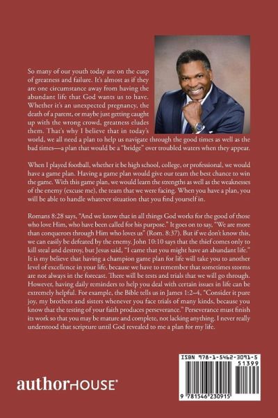 So many of our youth today are on the cusp of greatness and failure. It's almost as if they are one circumstance away from having the abundant life that God wants us to have. Whether it's an unexpected pregnancy, the death of a parent, or maybe just getting caught up with the wrong crowd, greatness eludes them. That's why I believe that in today's world, we all need a plan to help us navigate through the good times as well as the bad times-a plan that would be a "bridge" over troubled waters when they appear. When I played football, whether it be high school, college, or professional, we would have a game plan. Having a game plan would give our team the best chance to win the game. With this game plan, we would learn the strengths as well as the weaknesses of the enemy (excuse me), the team that we were facing. When you have a plan, you will be able to handle whatever situation that you find yourself in. Romans 8:28 says, "And we know that in all things God works for the good of those who love Him, who have been called for his purpose." It goes on to say, "We are more than conquerors through Him who loves us" (Rom. 8:37). But if we don't know this, we can easily be defeated by the enemy. John 10:10 says that the thief comes only to kill steal and destroy, but Jesus said, "I came that you might have an abundant life." It is my believe that having a champion game plan for life will take you to another level of excellence in your life, because we have to remember that sometimes storms are not always in the forecast. There will be tests and trials that we will go through. However, having daily reminders to help you deal with certain issues in life can be extremely helpful. For example, the Bible tells us in James 1:2-4, "Consider it pure joy, my brothers and sisters whenever you face trials of many kinds, because you know that the testing of your faith produces perseverance." Perseverance must finish its work so that you may be mature and complete, not lacking anything. I never really understood that scripture until God revealed to me a plan for my life.