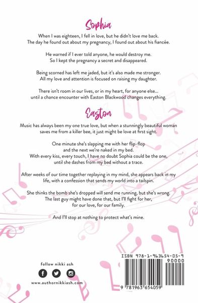 Sophia When I was eighteen, I fell in love, but he didn't love me back. The day he found out about my pregnancy, I found out about his fiancée. He warned if I ever told anyone, he would destroy me. So I kept the pregnancy a secret and disappeared. Being scorned has left me jaded, but it's also made me stronger. All my love and attention is focused on raising my daughter. There isn't room in our lives, or in my heart, for anyone else... until a chance encounter with Easton Blackwood changes everything. Easton Music has always been my one true love, but when a stunningly beautiful woman saves me from a killer bee, it just might be love at first sight. One minute she's slapping me with her flip-flop and the next we're naked in my bed. With every kiss, every touch, I have no doubt Sophia could be the one, until she dashes from my bed without a trace. After weeks of our time together replaying in my mind, she appears back in my life, with a confession that sends my world into a tailspin. She thinks the bomb she's dropped will send me running, but she's wrong. The last guy might have done that, but I'll fight for her, for our love, for our family. And I'll stop at nothing to protect what's mine.