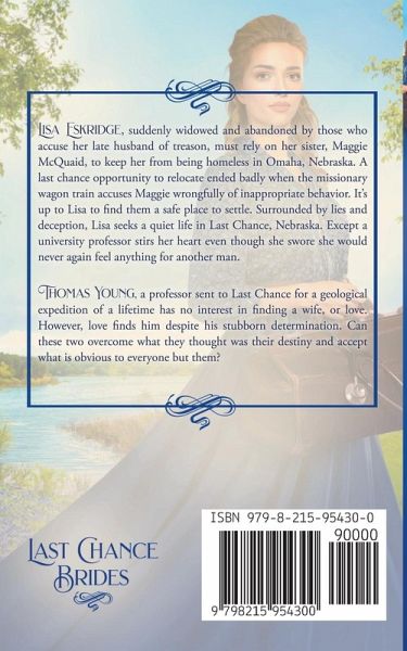 Lisa Eskridge, suddenly widowed and abandoned by those who accuse her late husband of treason, must rely on her sister, Maggie McQuaid, to keep her from being homeless in Omaha, Nebraska. A last chance opportunity to relocate ended badly when the missionary wagon train accuses Maggie wrongfully of inappropriate behavior. It's up to Lisa to find them a safe place to settle. Surrounded by lies and deception, Lisa seeks a quiet life in Last Chance, Nebraska. Except a university professor stirs her heart even though she swore she would never again feel anything for another man. Thomas Young, a professor sent to Last Chance for a geological expedition of a lifetime has no interest in finding a wife, or love. However, love finds him despite his stubborn determination. Can these two overcome what they thought was their destiny and accept what is obvious to everyone but them?