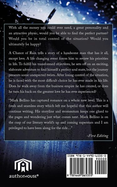 With all the money you could ever need, a great personality and an attractive physic, would you be able to find the perfect partner? Would you be in total control of the situation? Would you ultimately be happy? A Chance of Rain tells a story of a handsome man that has it all, except love. A life changing event forces him to review his priorities in life. To fulfill his transformed objectives, he sets off on an exciting, elaborate adventure to find himself a perfect soul mate, but the journey presents some unexpected twists. After losing control of the situation, he is faced with the most difficult choice he has ever made in his life. Does he walk away from the business empire he has created, or does he turn his back on the greatest love he has ever experienced? "Mark Bellino has captured romance on a whole new level. This is a fresh and seamless story which left me hopeful that this author will continue writing. His storyline and momentum keeps one glued to the pages and wondering just what comes next. Mark Bellino is on the cusp of our literary world's up and coming superstars and I am privileged to have been along for the ride..." - First Editing