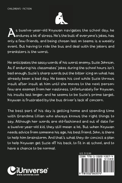 As twelve-year-old Koywan navigates the school day, he endures a lot of stress. Hes the butt of everyones jokes, has only a few friends, and being chosen last on teams is a weekly event. But having to ride the bus and deal with the jokers and pranksters is the worst. He anticipates the sassy words of his worst enemy, Suzie Johnson. As if enduring his classmates jokes during the school hours isnt bad enough, Suzies sharp words put the bitter icing on what has already been a bad day. He keeps his cool while Suzie throws insult after insult at him until she moves to the next person; few are exempt from her nastiness. Unfortunately for Koywan, his insults last longer, and he seems to be Suzies prime target. Koywan is frustrated by the bus drivers lack of concern. The best part of his day is getting home and spending time with Grandma Lillian who always knows the right things to say. Although her words are old-fashioned and out of date for a twelve-year-old kid, they still mean a lot. But when Koywan needs advice from someone his age, his best friend, John, is there to help him brainstorm. And thats what they do: concoct a plan to help Koywan get Suzie off his back, to fit in at school, and to have a chance to be normal.