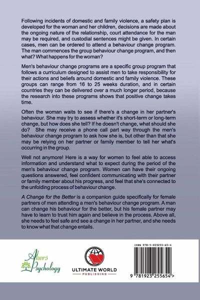 Following incidents of domestic and family violence, a safety plan is developed for the woman and her children, decisions are made about the ongoing nature of the relationship, court attendance for the man may be required, and custodial sentences might be given. In certain cases, men can be ordered to attend a behaviour change program. The man commences the group behaviour change program, and then what? What happens for the woman? Men's behaviour change programs are a specific group program that follows a curriculum designed to assist men to take responsibility for their actions and beliefs around domestic and family violence. These groups can range from 16 to 25 weeks duration, and in certain countries they can be delivered over a much longer period, because the research into these programs shows that positive change takes time. Often the woman waits to see if there's a change in her partner's behaviour. She may try to assess whether it's short-term or long-term change, but how does she tell? If he doesn't change, what should she do? She may receive a phone call part way through the men's behaviour change program to ask how she is, but other than that she may be relying on her partner or family member to tell her what's occurring in the group. Well not anymore! Here is a way for women to feel able to access information and understand what to expect during the period of the men's behaviour change program. Women can have their ongoing questions answered, feel confident communicating with their partner or family member about his progress, and feel that she's connected to the unfolding process of behaviour change. A Change for the Better is a companion guide specifically for female partners of men attending a men's behaviour change program. A man can change his behaviour for the better, but his female partner may have to learn to trust him again and believe in the process. Above all, she needs to feel safe and see a change in her partner, and she needs to know what that change entails.