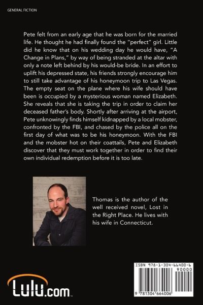 Pete felt from an early age that he was born for the married life. He thought he had finally found the "perfect" girl. Little did he know that on his wedding day he would have, "A Change in Plans," by way of being stranded at the altar with only a note left behind by his would-be bride. In an effort to uplift his depressed state, his friends strongly encourage him to still take advantage of his honeymoon trip to Las Vegas. The empty seat on the plane where his wife should have been is occupied by a mysterious woman named Elizabeth. She reveals that she is taking the trip in order to claim her deceased father's body. Shortly after arriving at the airport, Pete unknowingly finds himself kidnapped by a local mobster, confronted by the FBI, and chased by the police all on the first day of what was to be his honeymoon. With the FBI and the mobster hot on their coattails, Pete and Elizabeth discover that they must work together in order to find their own individual redemption before it is too late.