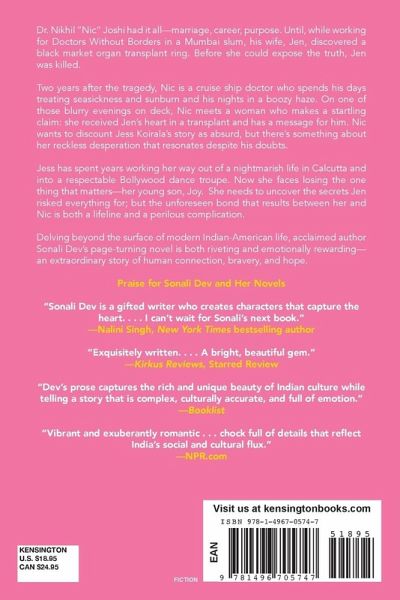 Kirkus Reviews Best Fiction of the Year ● NPR Great Reads ● RUSA Reading List Longlist Selection ● RT Book Reviews Reviewers Choice Award Winner "A rising talent." -Booklist Dr. Nikhil 'Nic' Joshi had it all-marriage, career, purpose. Until, while working for Doctors Without Borders in a Mumbai slum, his wife, Jen, discovered a black market organ transplant ring. Before she could expose the truth, Jen was killed. Two years after the tragedy, Nic is a cruise ship doctor who spends his days treating seasickness and sunburn and his nights in a boozy haze. On one of those blurry evenings on deck, Nic meets a woman who makes a startling claim: she received Jen's heart in a transplant and has a message for him. Nic wants to discount Jess Koirala's story as absurd, but there's something about her reckless desperation that resonates despite his doubts. Jess has spent years working her way out of a nightmarish life in Calcutta and into a respectable Bollywood dance troupe. Now she faces losing the one thing that matters-her young son, Joy. She needs to uncover the secrets Jen risked everything for; but the unforeseen bond that results between her and Nic is both a lifeline and a perilous complication. Delving beyond the surface of modern Indian-American life, acclaimed author Sonali Dev's page-turning novel is both riveting and emotionally rewarding-an extraordinary story of human connection, bravery, and hope. Praise for Sonali Dev and Her Novels "Sonali Dev is a gifted writer who creates characters that capture the heart… I can't wait for Sonali's next book." -Nalini Singh, New York Times bestselling author "Exquisitely written... A bright, beautiful gem." -Kirkus Reviews, Starred Review, on The Bollywood Bride "Dev's prose captures the rich and unique beauty of Indian culture while telling a story that is complex, culturally accurate, and full of emotion." -Booklist on The Bollywood Bride "Vibrant and exuberantly romantic…chock full of details that reflect India's social and cultural flux." -NPR.com on A Bollywood Affair