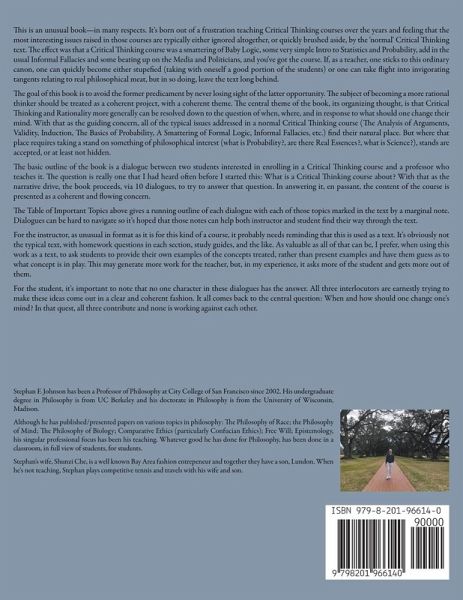 This is an unusual book-in many respects. It's born out of a frustration teaching Critical Thinking courses over the years and feeling that the most interesting issues raised in those courses are typically either ignored altogether, or quickly brushed aside, by the 'normal' Critical Thinking text. The effect was that a Critical Thinking course was a smattering of Baby Logic, some very simple Intro to Statistics and Probability, add in the usual Informal Fallacies and some beating up on the Media and Politicians, and you've got the course. If, as a teacher, one sticks to this ordinary canon, one can quickly become either stupefied (taking with oneself a good portion of the students) or one can take flight into invigorating tangents relating to real philosophical meat, but in so doing, leave the text long behind. The goal of this book is to avoid the former predicament by never losing sight of the latter opportunity. The subject of becoming a more rational thinker should be treated as a coherent project, with a coherent theme. The central theme of the book, its organizing thought, is that Critical Thinking and Rationality more generally can be resolved down to the question of when, where, and in response to what should one change one's mind. With that as the guiding concern, all of the typical issues addressed in a normal Critical Thinking course (The Analysis of Arguments, Validity, Induction, The Basics of Probability, A Smattering of Formal Logic, Informal Fallacies, etc.) find their natural place. But where that place requires taking a stand on something of philosophical interest (what is Probability?, are there Real Essences?, what is Science?), stands are accepted, or at least not hidden. The basic outline of the book is a dialogue between two students interested in enrolling in a Critical Thinking course and a professor who teaches it. The question is really one that I had heard often before I started this: What is a Critical Thinking course about? With that as the narrative drive, the book proceeds, via 10 dialogues, to try to answer that question. In answering it, en passant, the content of the course is presented as a coherent and flowing concern. The Table of Important Topics above gives a running outline of each dialogue with each of those topics marked in the text by a marginal note. Dialogues can be hard to navigate so it's hoped that those notes, along with a searchable Table of Contents and the Control-F function, can help both instructor and student find their way through the text. Because of that wondrous function, there's no need for an Index either. For the instructor, as unusual in format as it is for this kind of a course, it probably needs reminding that this is used as a text. It's obviously not the typical text, with homework questions in each section, study guides, and the like. As valuable as all of that can be, I prefer, when using this work as a text, to ask students to provide their own examples of the concepts treated, rather than present examples and have them guess as to what concept is in play. This may generate more work for the teacher, but, in my experience, it asks more of the student and gets more out of them. For the student, it's important to note that no one character in these dialogues has the answer. All three interlocutors are earnestly trying to make these ideas come out in a clear and coherent fashion. It all comes back to the central question: When and how should one change one's mind? In that quest, all three contribute and none is working against each other.