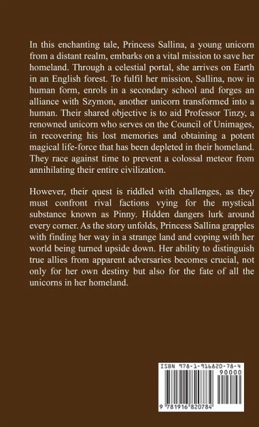 In this enchanting tale, Princess Sallina, a young unicorn from a distant realm, embarks on a vital mission to save her homeland. Through a celestial portal, she arrives on Earth in an English forest. To fulfil her mission, Sallina, now in human form, enrols in a secondary school and forges an alliance with Szymon, another unicorn transformed into a human. Their shared objective is to aid Professor Tinzy, a renowned unicorn who serves on the Council of Unimages, in recovering his lost memories and obtaining a potent magical life-force that has been depleted in their homeland. They race against time to prevent a colossal meteor from annihilating their entire civilization. However, their quest is riddled with challenges, as they must confront rival factions vying for the mystical substance known as Pinny. Hidden dangers lurk around every corner. As the story unfolds, Princess Sallina grapples with finding her way in a strange land and coping with her world being turned upside down. Her ability to distinguish true allies from apparent adversaries becomes crucial, not only for her own destiny but also for the fate of all the unicorns in her homeland.
