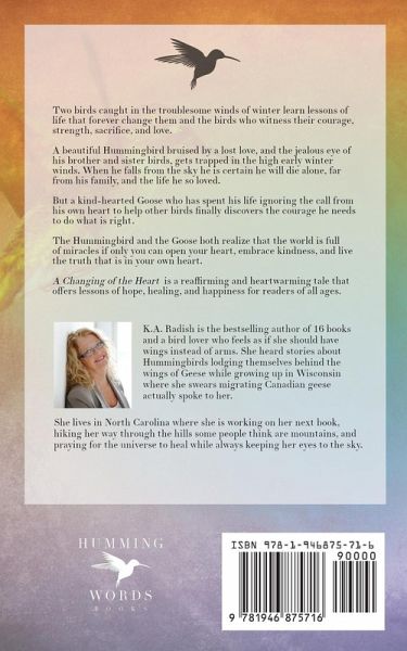TWO BIRDS caught in the troublesome winds of winter learn lessons of life that forever change them and the birds who witness their courage, strength, sacrifice, and love. A beautiful Hummingbird bruised by a lost love, and the jealous eyes of his brother and sister birds, gets trapped in the high early winter winds. When he falls from the sky he is certain he will die alone, far from his family, and the life he so loved. But a kind-hearted Goose who has spent his life ignoring the call from his own heart to help other birds finally discovers the courage he needs to do what is right. The Hummingbird and the Goose both realize that the world is full of miracles if only you can open your heart, embrace kindness, and live the truth that is in your own heart. A Changing of the Heart is a reaffirming and heartwarming tale that offers lessons of hope, healing, and happiness for readers of all ages.
