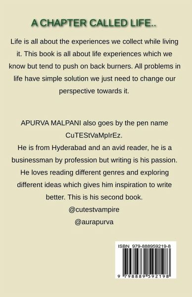 LIFE IS ALL ABOUT EXPERIENCES AND LESSONS LEARNED THROUGH OUT THE JOURNEY. THIS BOOK IS ABOUT THE LEARNING APURVA HAD THROUGHT OUT HIS JOURNEY. APURVA LOVES TO SHARE HIS EXPERIENCES AND ENCOURAGE PEOPLE SEEING LIFE WITH A DIFFERENT PERSPECTITVE ALLTOGETHER. HE SAYS LIFE IS TO LIVE AND ENJOY EVERY MOMENT BECAUSE EVERY EXPERIENCE IS A CHAPTER CALLED LIFE.
