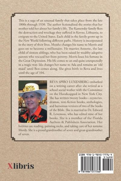 This is a saga of an unusual family that takes place from the late 1800s through 1930. The author fictionalized the stories that her mother told her about her family's life. The Kamensky family flees the destruction and wreckage they suffered in Kovno, Lithuania, to emigrate to the United States. Each child in the family grows up in the New World following different paths. History is incorporated in the story of their lives. Moishe changes his name to Morris and goes on to become a millionaire. He marries Annette, the last child of sixteen siblings, who has been raised by wealthy adoptive parents who rescued her from poverty. Morris loses his fortune in the Great Depression. His life comes to an end quite unexpectedly in a tragic way. Ida changes her name to Ada and remains an 'old maid' until Ben comes along. She gives birth to Reva and lives until the age of 104.