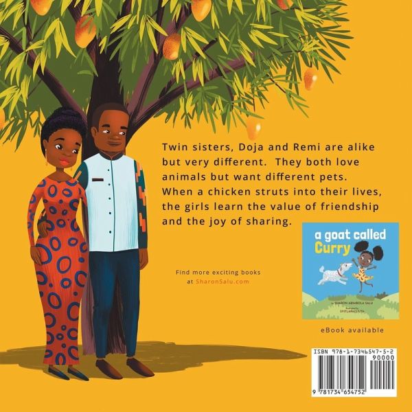 A heartwarming picture book with bright, colorful illustrations, telling the story of friendship and sharing between African twin sisters and their pet chicken. Deep in the heart of Lagos in a beautiful house surrounded by trees there lived a man, a woman, and their daughters. Twin sisters, Doja and Remi are alike but very different. They both love animals but want different pets. Doja loves playing soccer and flying airplanes. She wants a puppy. Remi, on the other hand, loves making colorful art, painting portraits, drawing pictures, and playing the guitar. She wants a pet canary. As their 7th birthday approaches, the girls learn important life lessons. When a chicken struts into their lives, the girls learn the value of friendship and the joy of sharing. This book is the sequel to A Goat Called Curry, the heartwarming story of Mofolusho and her pet goat. The secondary characters in this picture book are the ingredients used to make Mozambique style Chicken Peri Peri, a popular African dish, with Portuguese origins. Recommended for preschool kids, kindergarten kids, toddlers and readers of all ages.