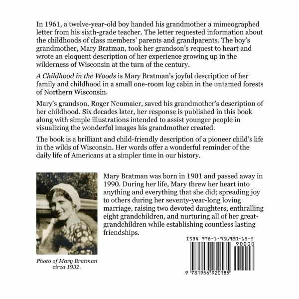 A Childhood in the Woods is Mary Bratman's joyful description of her family and childhood in a small one-room log cabin in the untamed forests of Northern Wisconsin. In 1961, a twelve-year-old boy handed his grandmother a mimeographed letter from his sixth-grade teacher. The letter requested information about the childhoods of class members' parents and grandparents. The boy's grandmother, Mary Bratman, took her grandson's request to heart and wrote an eloquent description of her experience growing up in the wilderness of Wisconsin at the turn of the century. Mary's grandson, Roger Neumaier, saved his grandmother's description of her childhood. Six decades later, her response is published in this book along with simple illustrations intended to assist younger people in visualizing the wonderful images his grandmother created. The book is a brilliant and child-friendly description of a pioneer child's life in the wilds of Wisconsin. Her words offer a wonderful reminder of the daily life of Americans at a simpler time in our history.