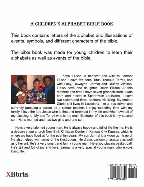 This book contains letters of the alphabet and illustrations of events, symbols, and different characters of the bible. The bible book was made for young children to learn their alphabets as well as events and character¿s of the bible.