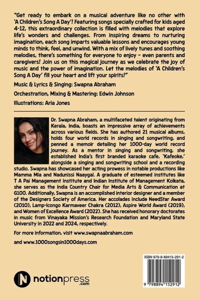 "Get ready to embark on a musical adventure like no other with 'A Children's Song A Day'! Featuring songs specially crafted for kids aged 4-12, this extraordinary collection is filled with melodies that explore life's wonders and challenges. From inspiring dreams to nurturing imagination, each song imparts valuable lessons and encourages young minds to think, feel, and unwind. With a mix of lively tunes and soothing melodies, there's something for everyone to enjoy - even parents and caregivers! Join us on this magical journey as we celebrate the joy of music and the power of imagination. Let the melodies of 'A Children's Song A Day' fill your heart and lift your spirits!" Music & Lyrics & Singing: Swapna Abraham Orchestration, Mixing & Mastering: Edwin Johnson Illustrations: Aria Jones