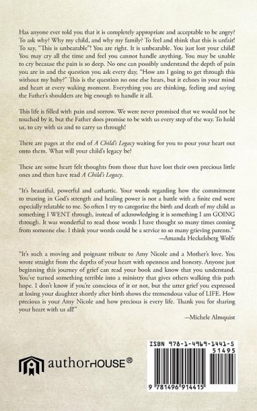 Has anyone ever told you that it is completely appropriate and acceptable to be angry? To ask why? Why my child, and why my family? To feel and think that this is unfair! To say, "This is unbearable"! You are right. It is unbearable. You just lost your child! You may cry all the time and feel you cannot handle anything. You may be unable to cry because the pain is so deep. No one can possibly understand the depth of pain you are in and the question you ask every day, "How am I going to get through this without my baby?" This is the question no one else hears, but it echoes in your mind and heart at every waking moment. Everything you are thinking, feeling and saying the Father's shoulders are big enough to handle it all. This life is filled with pain and sorrow. We were never promised that we would not be touched by it, but the Father does promise to be with us every step of the way. To hold us, to cry with us and to carry us through! There are pages at the end of A Child's Legacy waiting for you to pour your heart out onto them. What will your child's legacy be? These are some heart felt thoughts from those that have lost their own precious little ones and then have read A Child's Legacy. "It's beautiful, powerful and cathartic. Your words regarding how the commitment to trusting in God's strength and healing power is not a battle with a finite end were especially relatable to me. So often I try to categorize the birth and death of my child as something I WENT through, instead of acknowledging it is something I am GOING through. It was wonderful to read those words I have thought so many times coming from someone else. I think your words could be a service to so many grieving parents." -Amanda Heckelsberg Wolfe "It's such a moving and poignant tribute to Amy Nicole and a Mother's love. You wrote straight from the depths of your heart with openness and honesty. Anyone just beginning this journey of grief can read your book and know that you understand. You've turned something terrible into a ministry that gives others walking this path hope. I don't know if you're conscious of it or not, but the utter grief you expressed at losing your daughter shortly after birth shows the tremendous value of LIFE. How precious is your Amy Nicole and how precious is every life. Thank you for sharing your heart with us all!" -Michele Almquist
