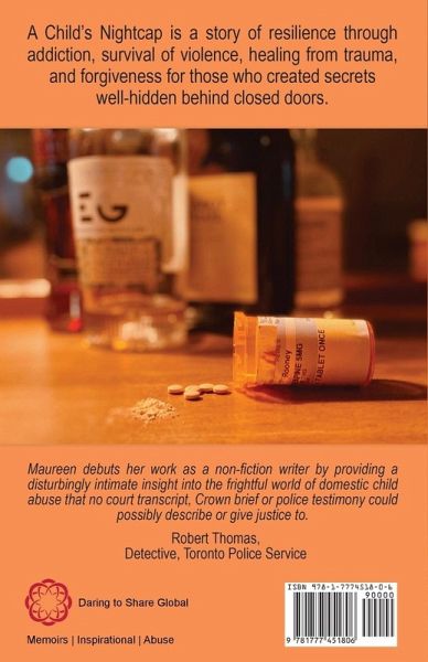 A Childs's Nightcap is a story of resilience through addiction, survival of violence, healing from trauma, and forgiveness for those who created secrets well-hidden behind closed doors. Maureen debuts her work as a non-fiction writer by providing a disturbingly intimate insight into the frighful world of domestic child abuse that no court transcript, Crown brief or police testimony could possibly describe or give justice to. Robert Thomas, Detective, Toronto Police Service