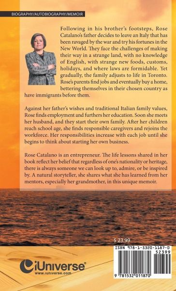 Following in his brother's footsteps, Rose Catalano's father decides to leave an Italy that has been ravaged by the war and try his fortunes in the New World. They face the challenges of making their way in a strange land, with no knowledge of English, with strange new foods, customs, holidays, and where laws are formidable. Yet gradually, the family adjusts to life in Toronto. Rose's parents find jobs and eventually buy a home, bettering themselves in their chosen country as have immigrants before them. Against her father's wishes and traditional Italian family values, Rose finds employment and furthers her education. Soon she meets her husband, and they start their own family. After her children reach school age, she finds responsible caregivers and rejoins the workforce. Her responsibilities increase with each job until she begins to think about starting her own business. Rose Catalano is an entrepreneur. The life lessons shared in her book reflect her belief that regardless of one's nationality or heritage, there is always someone we can look up to, admire, or be inspired by. A natural storyteller, she shares what she has learned from her mentors, especially her grandmother, in this unique memoir.