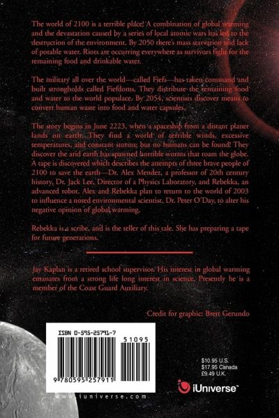 The story begins in June 2223 when a space ship from a distant planet lands on earth. It is a world of swirling winds, excessive temperatures, and constant storms. The crew soon discovers that the arid earth has spawned horrible worms that roam the globe. There are no humans to be found! A tape is discovered which describes the attempts of three brave people of 2100 to save the earth from the effects of global warming and the devastation of nuclear war. Alex and Rebekka, a robot, plan to return to the world of 2003 to influence a noted environmental scientist, Dr. Peter O Day, to alter his negative opinion of global warming in an effort to avert the devastation of the earth.