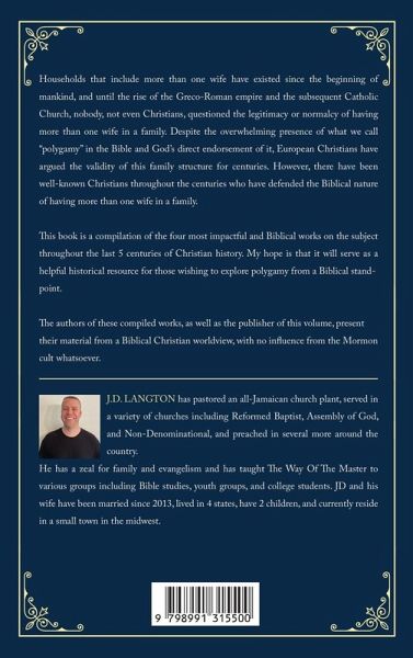 Households that include more than one wife have existed since the beginning of mankind, and until the rise of the Greco-Roman empire and the subsequent Catholic Church, nobody, not even Christians, questioned the legitimacy or normalcy of having more than one wife in a family. Despite the overwhelming presence of what we call "polygamy" in the Bible and God's direct endorsement of it, European Christians have argued the validity of this family structure for centuries. However, there have been well-known Christians throughout the centuries who have defended the Biblical nature of having more than one wife in a family. ¿This book is a compilation of the four most impactful and Biblical works on the subject throughout the last 5 centuries of Christian history. My hope is that it will serve as a helpful historical resource for those wishing to explore polygamy from a Biblical standpoint. The authors of these compiled works, as well as the publisher of this volume, present their material from a Biblical Christian worldview, with no influence from the Mormon cult whatsoever.